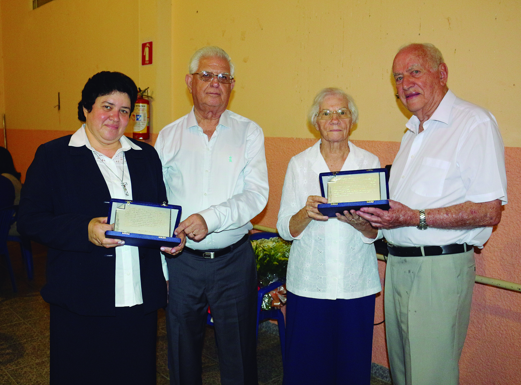 Os irmãos Laerte Carvalho e Dino Bruzadin entregaram um cartão de prata em reconhecimento ao valioso trabalho das Irmãs Luiza e Marília na Santa Casa