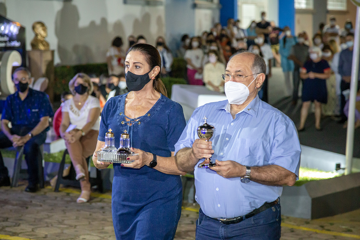 o provedor da Santa Casa, Roberto Afonso Colatreli e sua esposa, Lúcia, levaram o Pão e o Vinho para serem consagrados: momento foi de agradecer