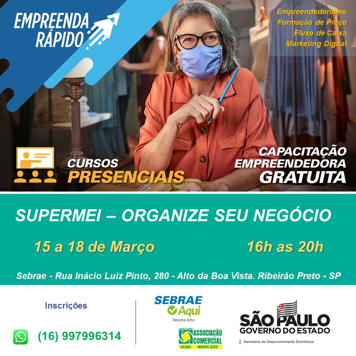 Dentre os dias 15 a 18 de março, das 16h às 20h, o Sebrae Aqui Monte Alto oferece o curso “Organize seu Negócio”, que faz parte do Programa Empreenda Rápido. O curso é indicado para quem é MEI e precisa organizar melhor o seu negócio para obter melhores resultados.