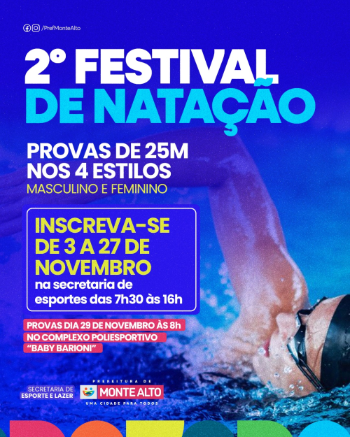 No dia 29 de novembro, a Prefeitura Municipal, por meio da Secretaria de Esportes, realizará a segunda edição do Festival de Natação. A competição será realizada nas piscinas do Complexo Baby Barioni e tem como objetivo incentivar a prática da natação como modalidade acessível.