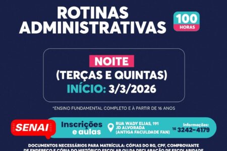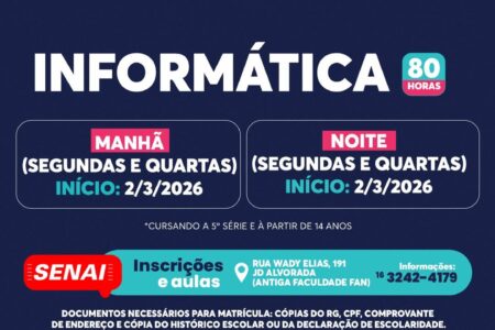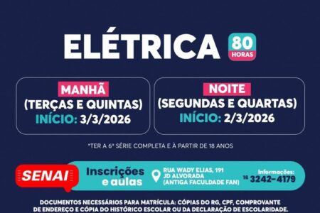 As aulas serão ministradas nos períodos da manhã, das 8h às 11h, e da noite, das 19h às 22h. Para mais informações, os interessados podem entrar em contato pelo telefone (16) 3242-4179.